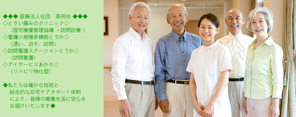 医療法人社団 英明会は、袋井市を中心とした地域の皆様に安心して在宅での生活を送っていただくために、とりい痛みのクリニック、トータルケアひかり、看護小規模多機能型居宅介護施設とうか、リハビリ特化型デイサービスあかりを運営しております。往診や通いサービス(デイサービス)、お泊りサービス(ショートステイ)、訪問看護、訪問リハビリテーション、介護支援専門員による支援サービス、訪問栄養指導など総合的な在宅ケアをサポートし、看取りを含めた在宅ケアに関するさまざまな場面で柔軟かつ迅速に対応できます。